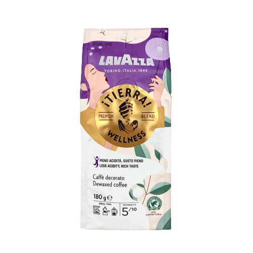 Premium blend with low acidity, full flavor, intensity 5/10. Ingredients: Arabica and Robusta.