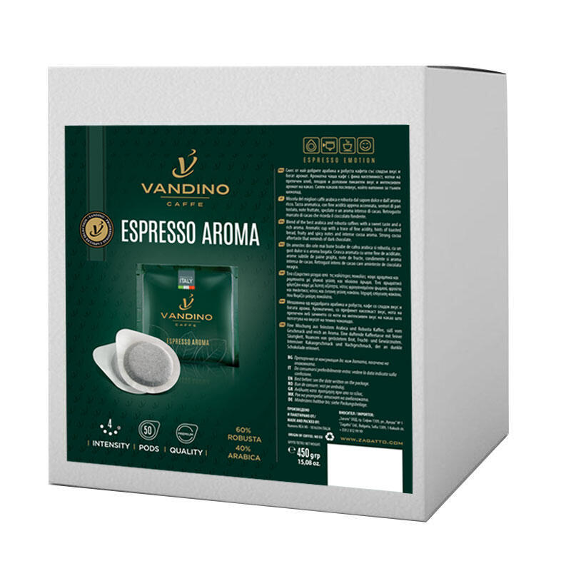 • Kафе на филтър дози VANDINO Espresso Aroma – смес от най – добрите Арабика и Робуста кафета със сладък вкус и богат аромат.