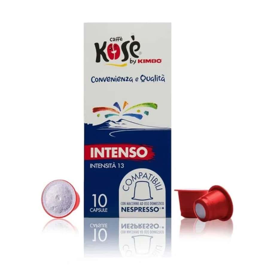 KOSE by Kimbo Intenso е плътно, силно и с нотки на шоколад кафе. Интензивно еспресо със силен плътен вкус. Идеалното кафе за стартиране на деня. Плътен и компактен каймак, с нотки на сушени плодове и шоколад. Сместа е създадена от най-благородните сортове Арабика и Робуста. Капсулите са съвместими с домашните кафемашини Nespresso. Балансираното дозиране между процентното съдържание на арабика и робуста, перфектната степен на изпичане и правилния период на зреене в склада допринасят за това този бленд да бъде отличен по отношение на вкус, аромат и кремообразност.